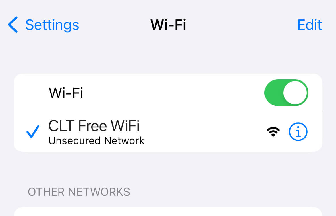 - Go to Wi-Fi Settings and Forget the network. Next, turn Wi-Fi off and turn it back on. Now reconnect to the CLT Free WiFi network.