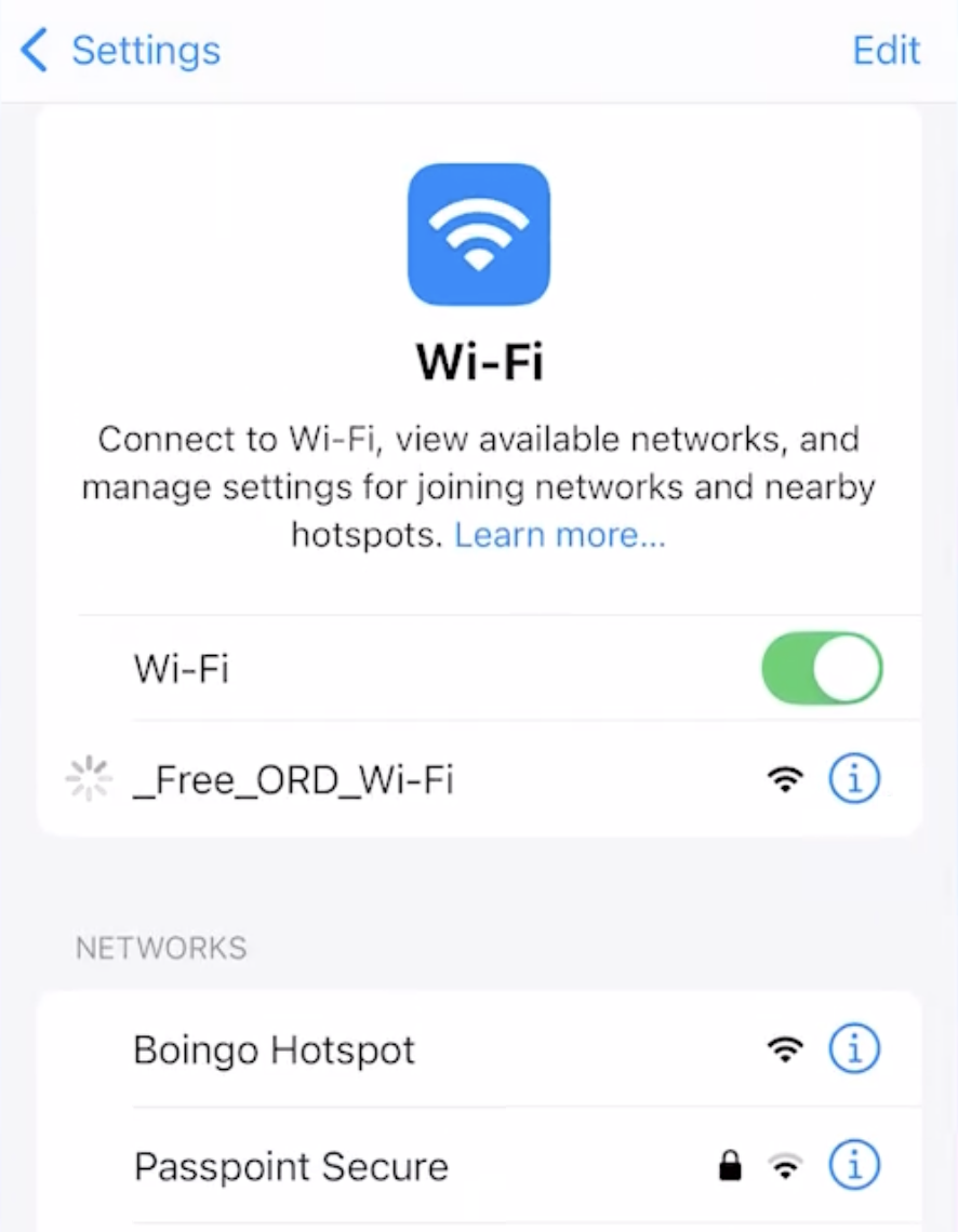 - Join “_Free_ORD _Wi-Fi” or “Boingo Hotspot” Wi-Fi network from the list of available networks.